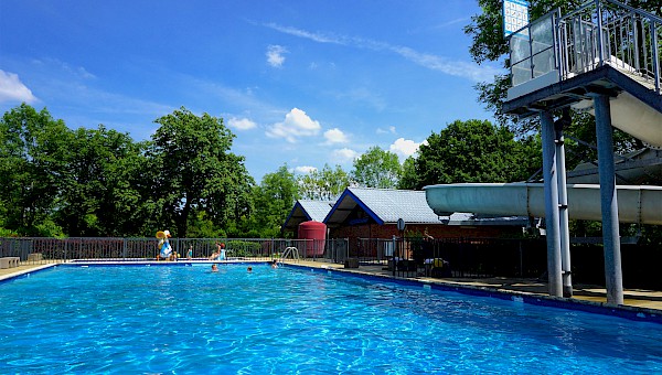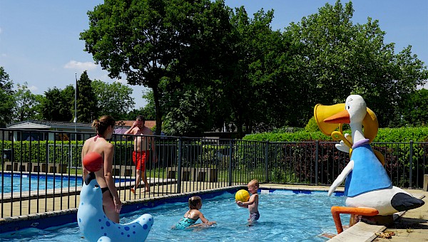 Zowel jongeren als ouderen kunnen zich op-en-top vermaken in ons zwembad. Voor de jeugd is er een 40-meter lange glijbaan, voor de kleintjes een apart kinderbad. Voor de ouderen is er een verwarmd gedeelte. Ooijke Ooievaar, onze grote kindervriendin, versiert het bad en draagt een trombone die op afroep een watergordijn tevoorschijn tovert. Dit alles maakt een bezoek aan ons zwembad tot één groot feest! Geopend vanaf hemelvaart.